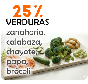 25% verduras: zanahoria, papa, chayote, calabaza y ejotes.