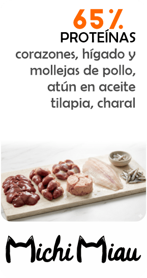 65% proteína real: hígado, corazones, mollejas de pollo, charales y atún.