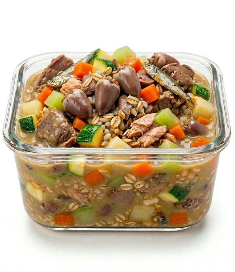 65% proteína real: hígado, corazones y mollejas. Nutrición completa con hidratación real.